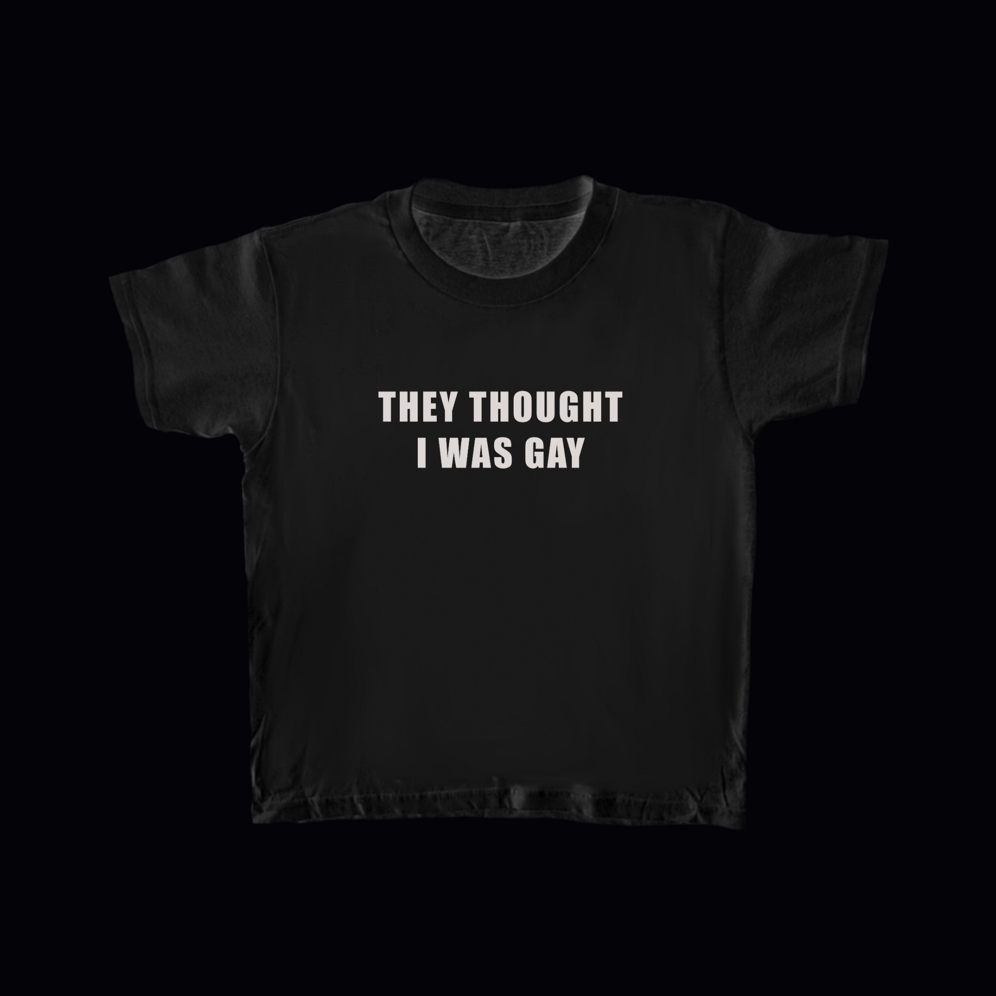 White "THEY THOUGHT I WAS GAY" print on Black baby tee