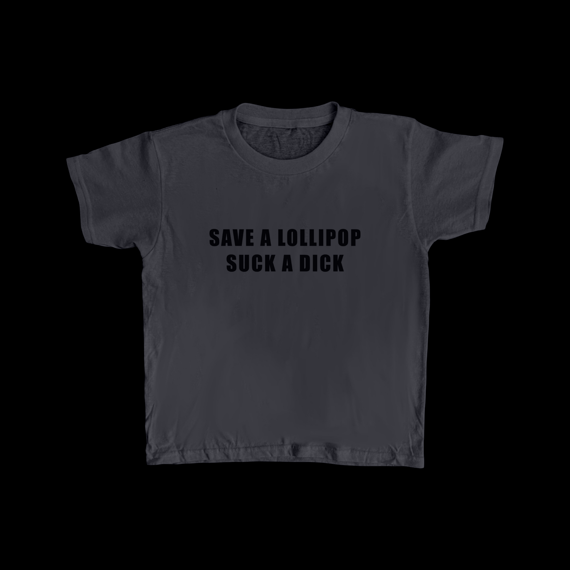 Black "SAVE A LOLLIPOP SUCK A DICK" print on Charcoal baby tee